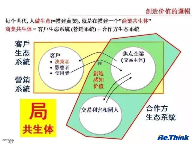 企业为客户创造价值叫”客户生态”,为合作方创造价值叫”合作方生态”, 这两个系统放在一起,才搭建了一个生意, 形成一个局,也就是搭一个“商业共生体”。