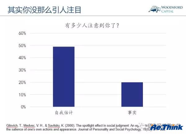 他们让一些学生穿上一件非常夸张的T恤,从学校里的阶梯教室门口走进去。学者让这些学生猜,教室里大约有多少其他学生会注意到他/她。然后学者又问教室里那些学生,有多少人记得刚刚进入教室的那位学生身穿的T恤上是什么图案?结果如下。