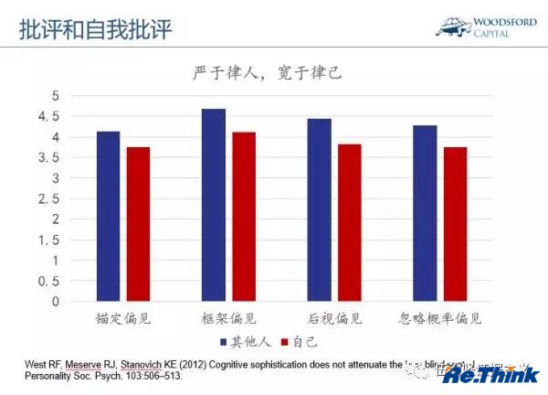 如上图所示,这些身穿怪T恤的学生,自我感觉大约有一半其他学生会注意到他们。事实上,对他们身上穿的T恤有印象的只有大约20%的学生。 这个实验告诉我们:我们人类可能犯的一个通病就是太把自己当回事。在很多时候,别人根本没空来在意你。不管你是优秀的冠军,或者出丑的笑柄,其实你都没那么重要。 2017年2月,新加坡总理李显龙在接受媒体采访时表示,作为一个领导人,最重要的素质之一就是不要把自己看的太重(Don't take yourself or your philosophy too seriously)。他想要强调的也是这个相同的道理。3 对别人客观,对自己主观 我记得以前在学校里读书的时候,老师会时不时组织一次“批评和自我批评”活动。在该活动中,我们被要求首先进行自我批评,然后再对其他同学进行批评,并接受对方对自己的批评。 研究显示,当我们在批评其他人时,往往可以“一阵见血”,很容易指出对方身上存在的不足和弱点。但是当轮到对自己进行自我批评时,前面那股“客观”劲一下子就消失了。