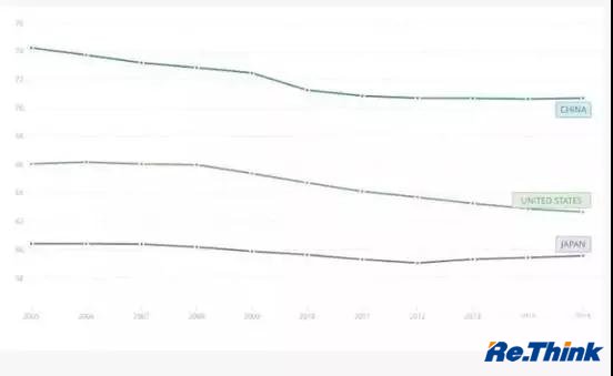 下面这张图是世界银行公布的数据,2015年中国的劳动参与率达到70%,世界第一,一骑绝尘。